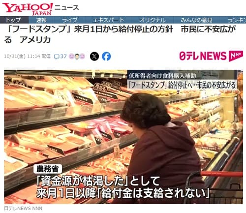 そして、11月1日から約4200万人が受給している「フードスタンプ」、つまりアメリカ版生活保護による食料配布が打ち切られました。今後、低所得者層を中心に各地で大規模な抗議デモが始まり、どさくさに紛れてテロ事件を起こす者も現れると思います。