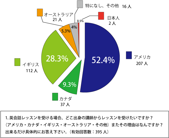 TOP > プレスリリース一覧 > 英会話を習いたいと考えている人が希望する講師の出身国と経歴 英会話を習いたいと考えている人が希望する講師の出身国と経歴★50%以上がアメリカ出身講師が希望。約25%が学校教員など教育関係に関わる仕事をしていた(または現在もしている)講師を好む。(アトラス調べ) 【調査概要】