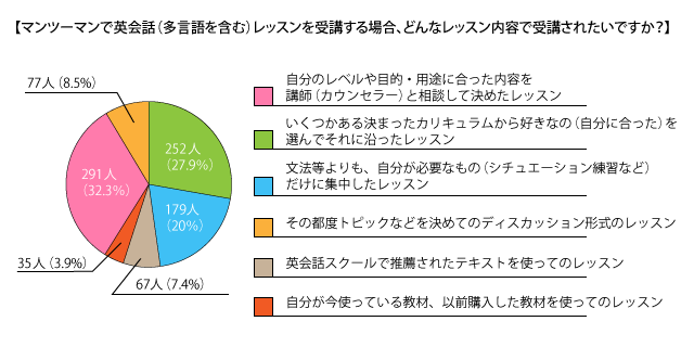★以前結果報告をしたアンケートの質問「スクール選びのポイント」で“料金”に次ぎ、2番目に多い回答を獲得していた項目が、“レッスン内容”でした。今回更に、そのレッスン内容の希望についてアンケートを実施したところ、一番多く、全体の32.2%の回答者が、スクールで決められた規程のカリキュラムに沿ったレッスンではなく、個々のレベルや目的、用途に併せて、講師やカウンセラーと相談し、カスタマイズされたレッスンを受けたいと望んでいることが分かりました。