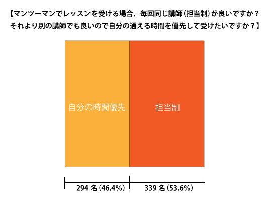 講師担当制(毎回同じ講師からレッスンを受ける)と、受講スケジュールを自由に選び、自分の時間を優先したいという選択については、ほぼ回答が二分され、担当制を希望するは53.6%、自分の時間優先は46.4%という結果になりました。