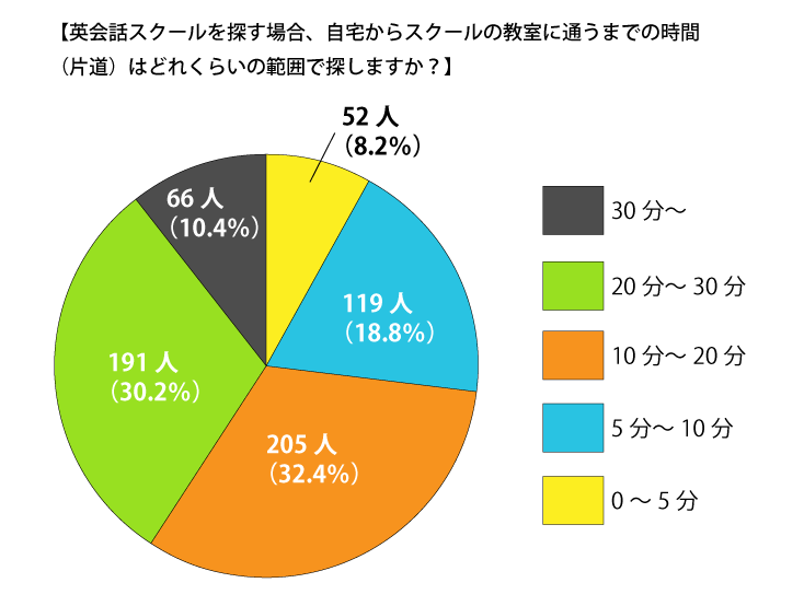 ★英会話スクールに通う場合、自宅からの通学時間(片道)については、全体の約90%の回答者が、30分以内と答えています。 平日にレッスンを受ける生徒については、通勤途中の最寄り駅や乗り換えターミナル駅近くのスクールを利用したいと考えている人も多いかと思いますが、いずれにせよ自宅から30分以上離れたスクールを利用しようと考える人は少ないことが分かります。